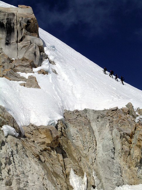 David continues downward on snowy rock just above high camp. |