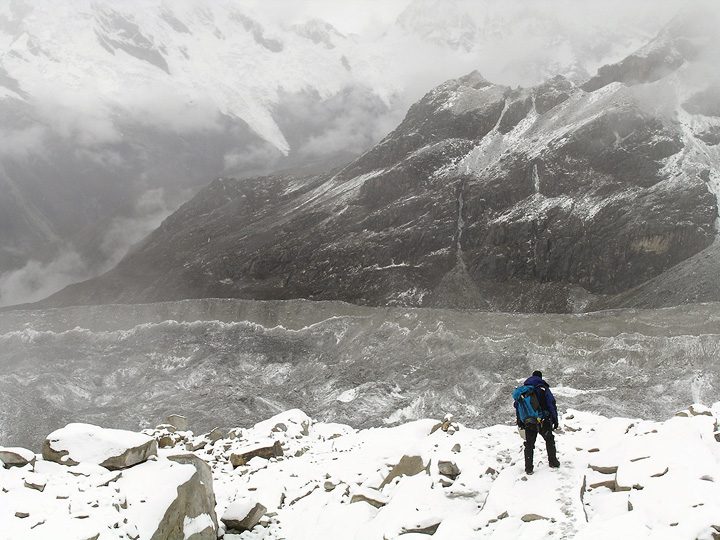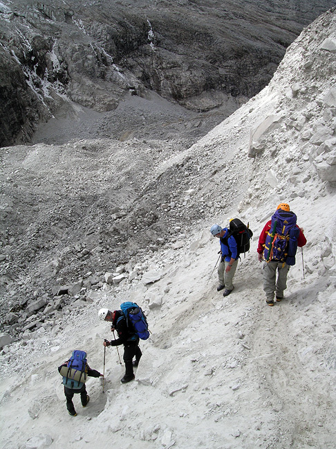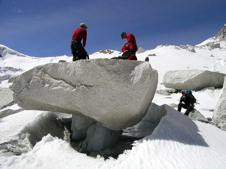 The approach to high camp includes a crossing of the giant glacier descending east from the Huandoy Group. Peter, David, Marc and Rich negotiate a short but tricky descent in the moraine. |