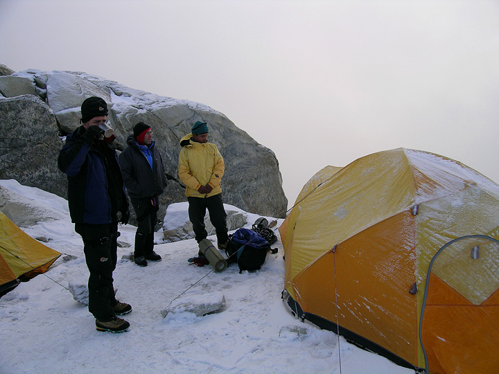 Setting up high camp was a bit too exciting in gusting winds, snow and the occasional crash of thunder. But we dutifully woke up at midnight for our climb. There were indeed a few stars out and we maintained a modicum of optimism. But not long into our climb the snow started to fall in earnest. We continued upward, hoping for the best, but eventually turned back in the snow and mist, concerned about the stability of the steep snow sloped disappearing into the darkness above. We returned to high camp for a couple more hours of sleep before a quick breakfast and descent to Base camp. This photo was taken just as we got up (for the second time) and started taking down the camp. |