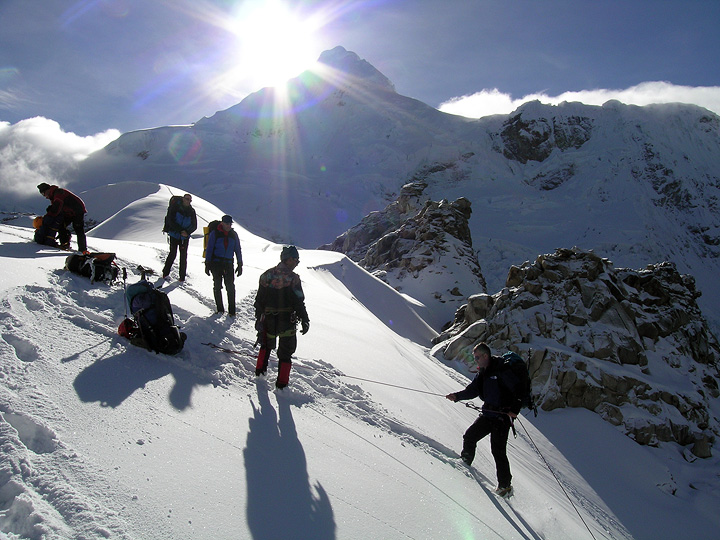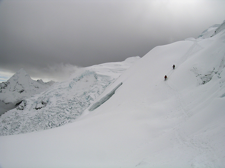 Moving up to Tocllaraju high camp, at about 5200 meters. You can see the increased cloudiness as the weather changes. |