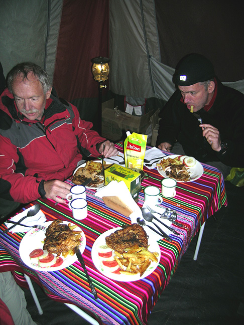 Supper in Base Camp. Emilio whips up a great dinner of chicken and fried potatoes. Unfortunately, the timing of the flash caught David with a fry halfway into his mouth! |