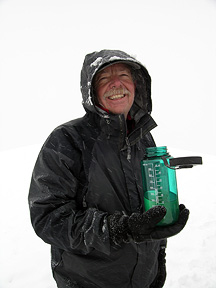 Again, the weather for our summit day proved foul, with intermittent snow and lots of cloud. But the track was good, as well as snow conditions, so we continued upward to the white-out summit. We never really did get much of a view until things broke a bit on the descent, when this photo was taken. |