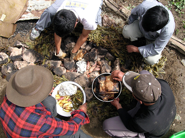 We had an extra day back in Huaraz, and chose to join the Alvarado family for a Pachamanca up at Emilio's house. A Pachamanca is Peru's answer to the buried-barbecue concept. Rocks are heated, 5 or 6 varieties of potatoes added, packets of wrapped spiced meat, beans, and the whole pile buried in the earth for about 45 minutes. From left to right we have Pedro, our driver and Emilio's brother-in-law, Yolanda (Pedro's wife), Emilio behind, with David, Marc and Rich on the right. The pile of dirt between Pedro and David hides our lunch. |