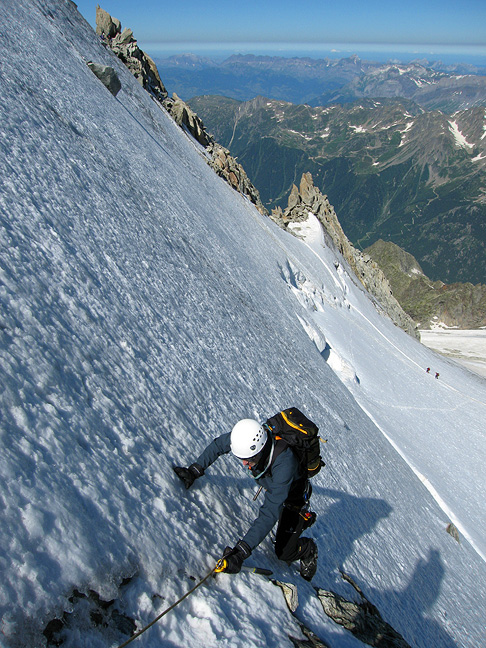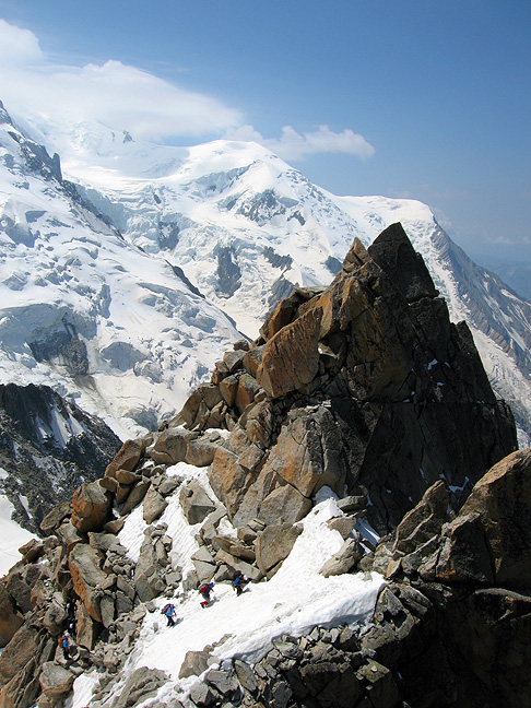 On our third day we moved our base of operations out of the valley and up into the high mountains. Here, we are climbing the Aréte des Cosmiques on the Aiguille du Midi. |