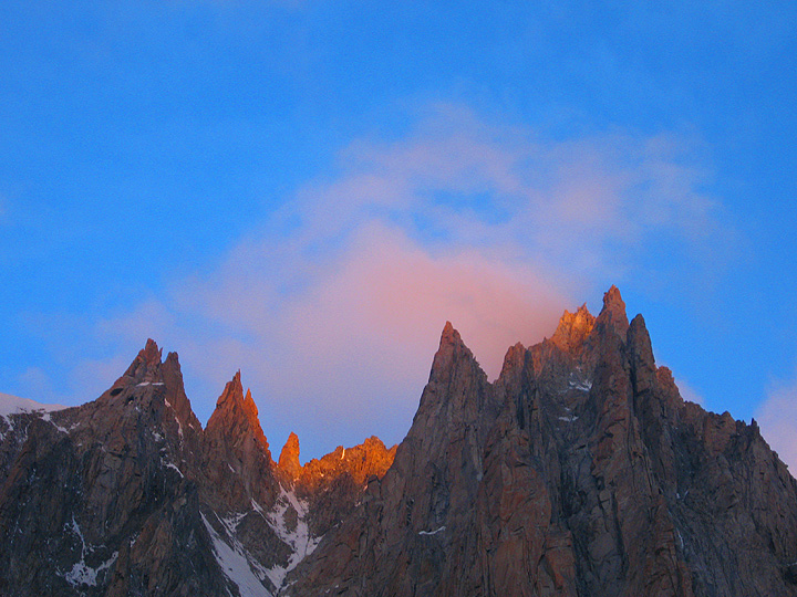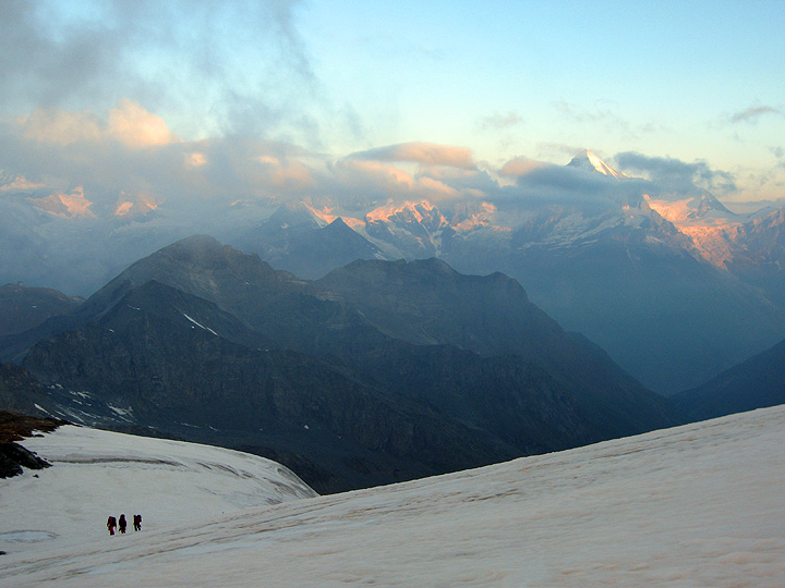 After an early breakfast the following morning, and quite a bit of hiking in the predawn darkness, the sun finally lights up the Weisshorn and other peaks behind. |