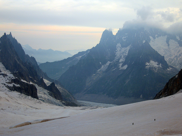 Looking down the Mer de Glace, en route to the Entrees. The Drus and Aiguille Verte are the peaks on the right with the Grepon and the Requin on the left. |