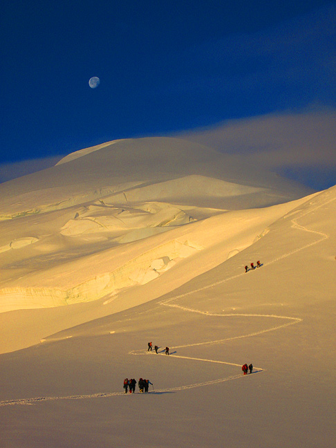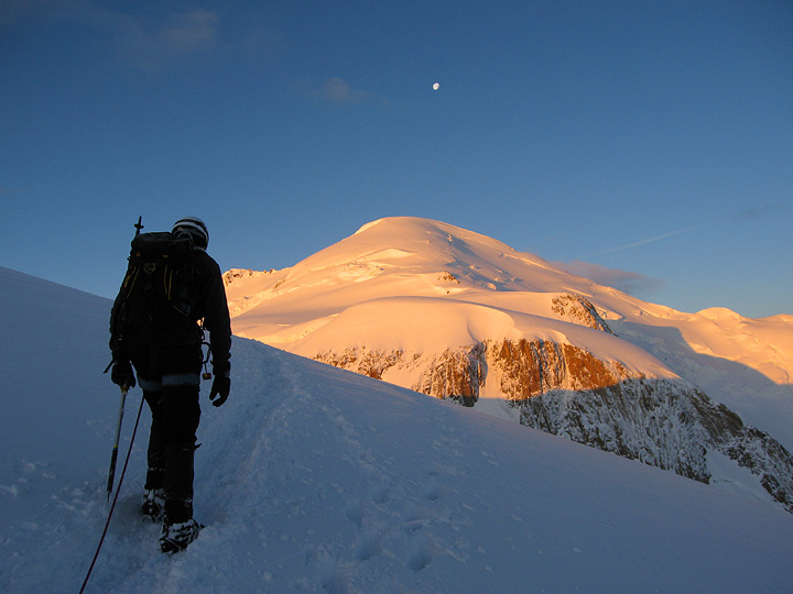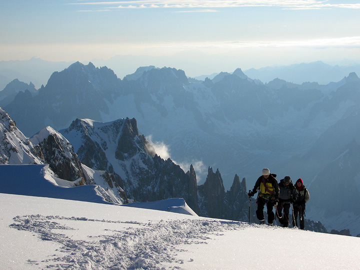 And the next day, with an early breakfast we traversed the Vallée Blanche, passing under the impressive east face of Mont Blanc du Tacul as the sun rose, heading for the Aiguille d'Entrèves. |