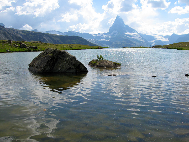 We continued on to Zermatt the following day and with a short walk to the Flualp hut, were in position for the Rimpfischhorn. This photo was taken from the small lake which lies enroute to the hut. The peak behind needs no introduction! |