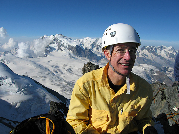 John on the summit of the Rimpfischhorn. Monte Rosa and the Liskamm behind. |
