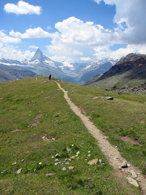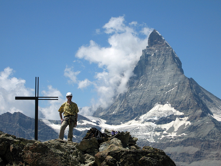 Actually, the Riffelhorn has two summits, one of which is adorned with a large cross. John poses with the Matterhorn. |