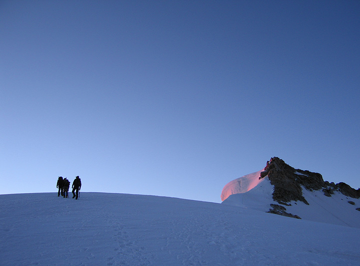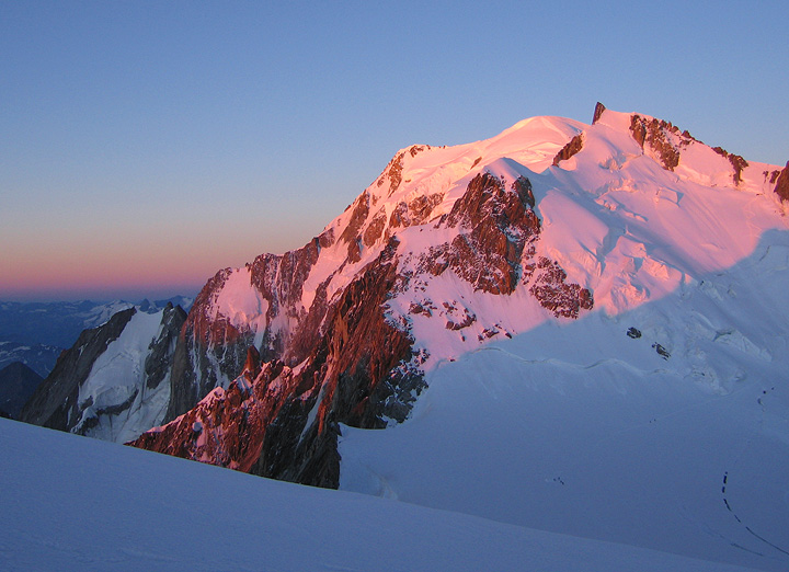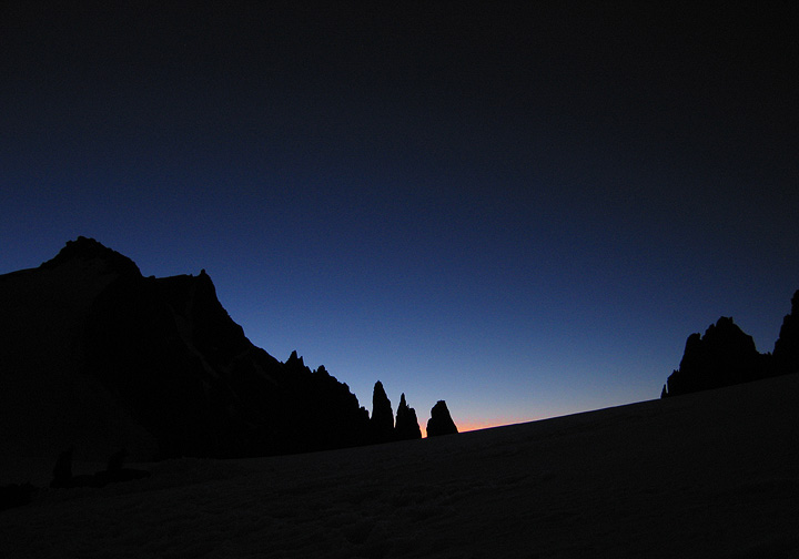 The following morning we were up before dawn to make an attempt on Mont Blanc. Some severe symptoms looking a lot like AMS, along with minor technology failure (only one of three headlamps was working by dawn!) led us to re-adjust our objectives to Mont Blanc du Tacul, seen here on the left. |