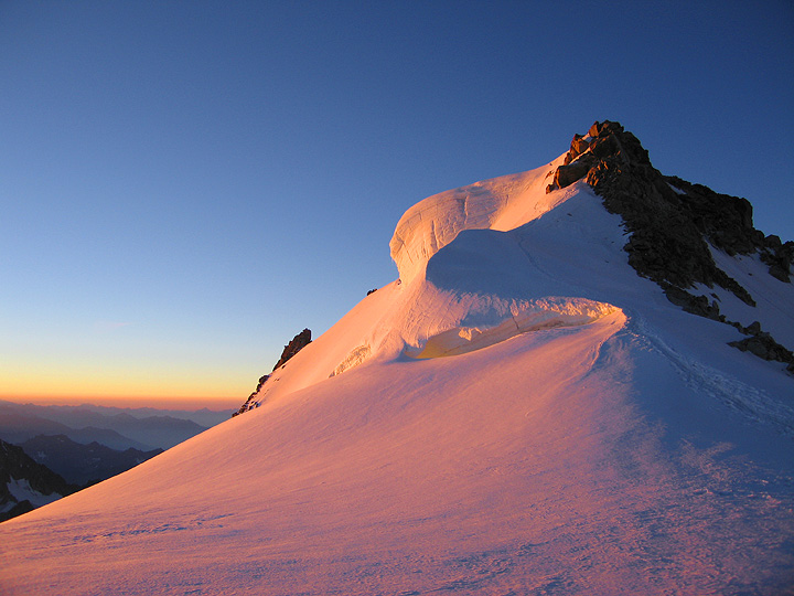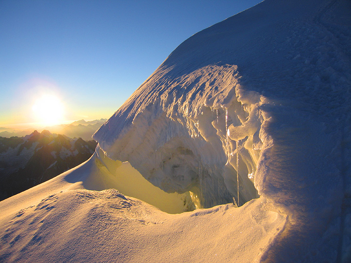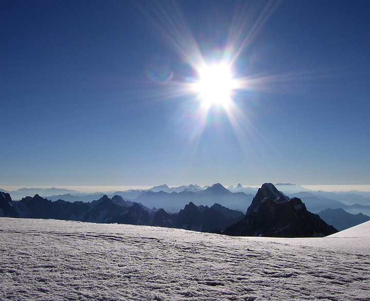 Looking east to the Grandes Jorasses (foreground, below and right of sun), the Matterhorn (pointy thing in the far distance, left of the Grandes Jorasses), Grand Combin (big honker just below the sun in middle distance), and Weisshorn (right leaning pyramid below and left of sun in far distance). |