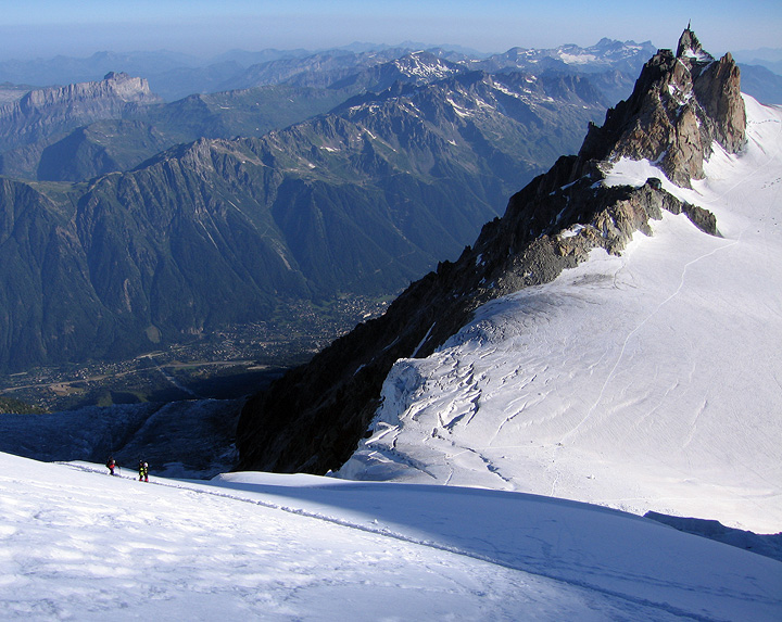 Descending to the Aiguille du Midi, Chamonix visible in the valley bottom. |