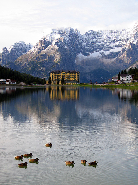 The lake at Misurina. You can see the new snow on the north-facing peaks behind. Every morning we would wake up and try to determine last night's snow-line, choosing our objectives accordingly. |