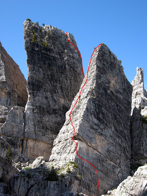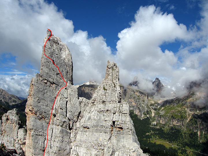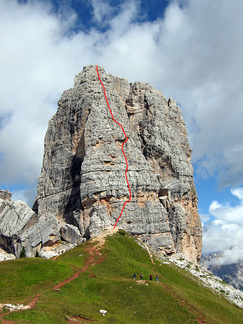 For our last day of climbing wee decided to return to the Cinque Torri and climb the Torre Grande, which we missed on our first visit. The "Guide's Route" is marked in red. |