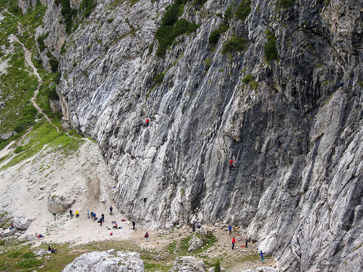 For our first day of climbing we visited the Cinque Torri group, just west of Cortina. There are hundreds of fun routes in this jumble of giant blocks. With a lift (this photo was taken from the top lift station) and good trails, it is very user friendly. |