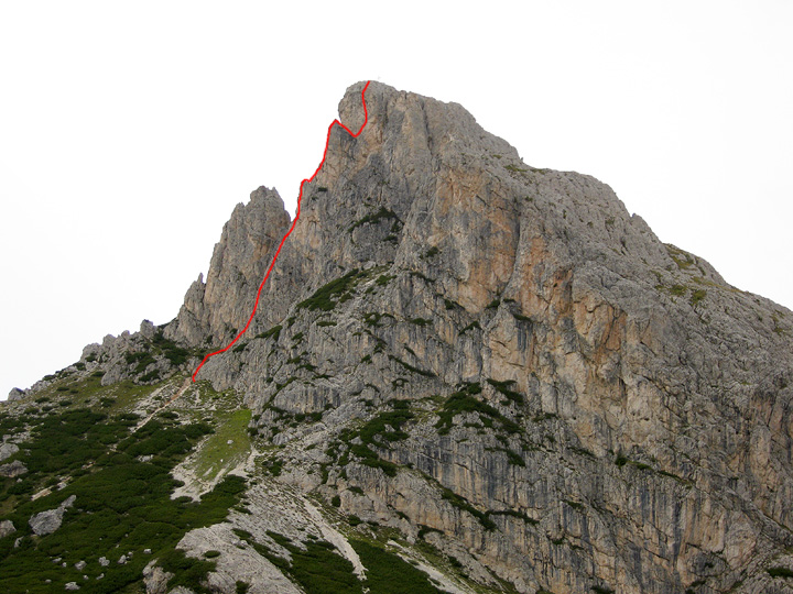 The Hexenstein, with the South Ridge marked. This is a very fun route, with very diverse climbing on great rock. |