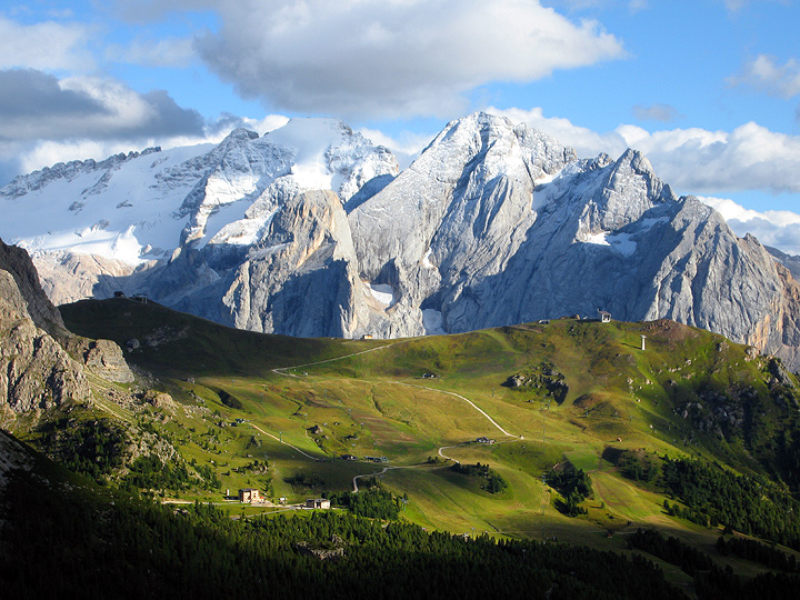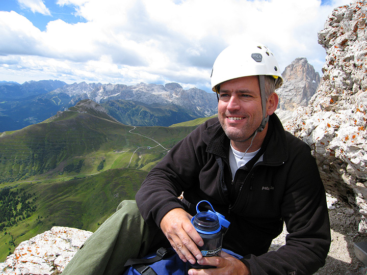 | Though David had been many times to the Alps, this was his first visit to the Dolomites. He joined Mark for five days of climbing. We began at the eastern edge of the range, with a base in Misurina, not far from Cortina. Later we moved over to a base in Canazei, closer to the Sella pass and the fine routes there. As was typical for this August, the weather was chilly and occasionally rainy. But every day, there was at least enough sun and warmth to dry of a bit of rock and go climbing. Fortunately for us, it seemed that most of the rain fell at night. |