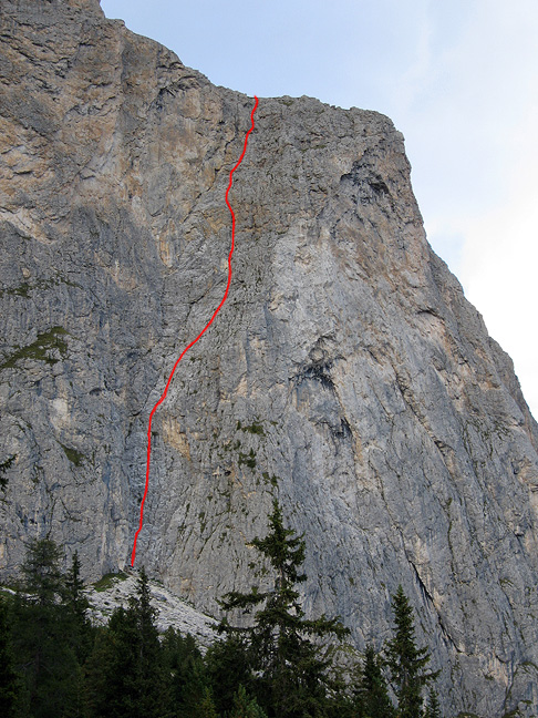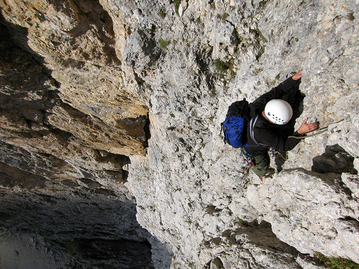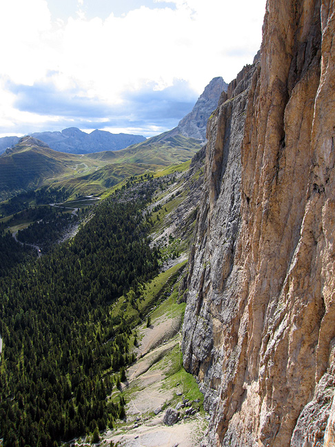 After a few pitches in the previous sport area the weather started to improve, so we went looking for bigger fare. And we found it on this route on the Gemsband of Piz Ciavazes. |