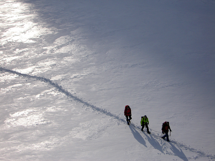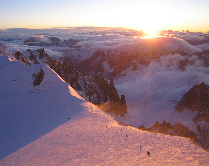 From Grindelwald we headed to Chamonix and jumped right on Mont Blanc to take advantage of a weather window. A cold wind, but otherwise beautiful summit day. Here we are looking down at the Col de la Brenva, from a vantage point on the Mur de la Cote. |