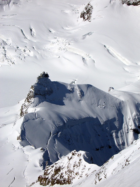 Looking down the SW ridge of the Monch to the Jungfraujoch installations. |