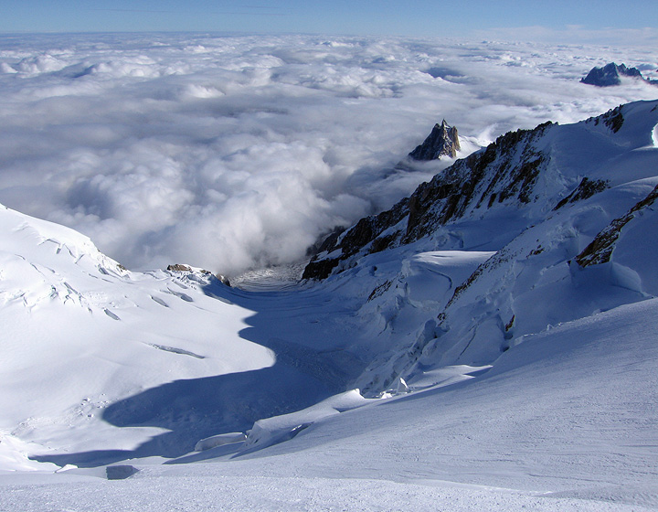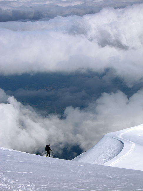 Approaching the Gouter hut on the descent, the nearby town of Sallanches played peek-a-boo in the clouds. |