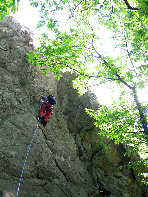 Early in the summer we had a day off–drizzly in the Chamonix valley but, as is often the case, sunny in Italy. So, through the tunnel, past Aosta and up through the vineyards to Arnad Bard (more or less). Here, Kathy starts up the first pitch of Dr. Jimmy. |
