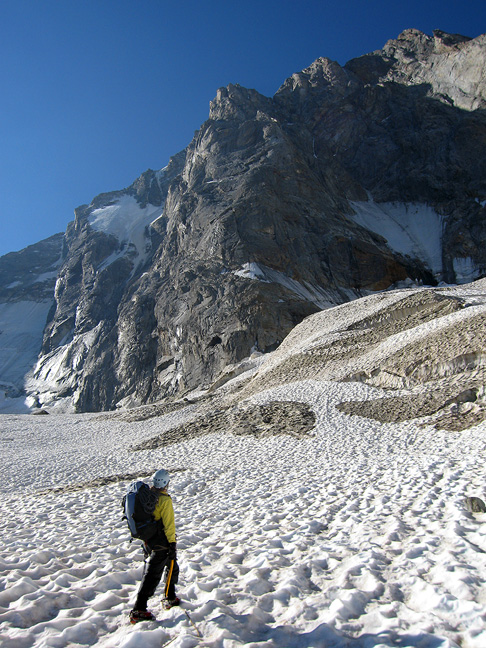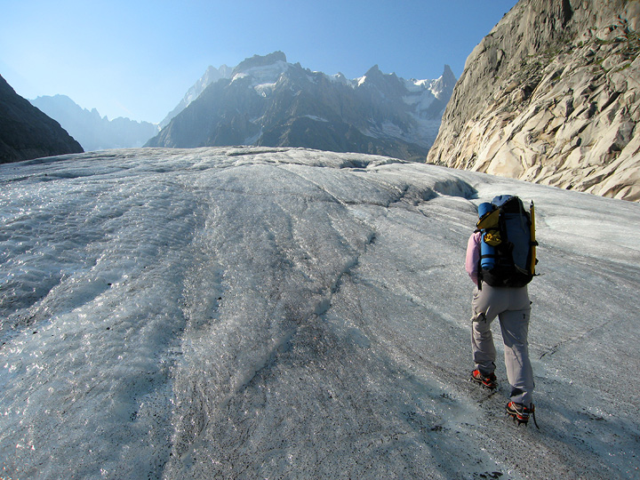 In the last couple years, we have blocked out a few days in the middle of the season with the hope of enjoying a climb or two of our own. In 2005, our time off coincided with about 5 days of solid rain, and we spent much of it driving around the Alps looking for the driest weather. (In the end we never were able to escape it.) This summer, however, things were looking a bit better. The forecast called for some afternoon buildup and a possibility of late afternoon showers or thunderstorms. We have always wanted to try the Walker Spur, and decided to go have a look. The hut keeper said the route was perhaps still a bit snowy, but probably doable. We decided to catch an early Montenvers train and climb the lower part of the Spur, bivy then try to get up and over the following day. Here, Kathy hikes up the Mer de Glace on the approach. |