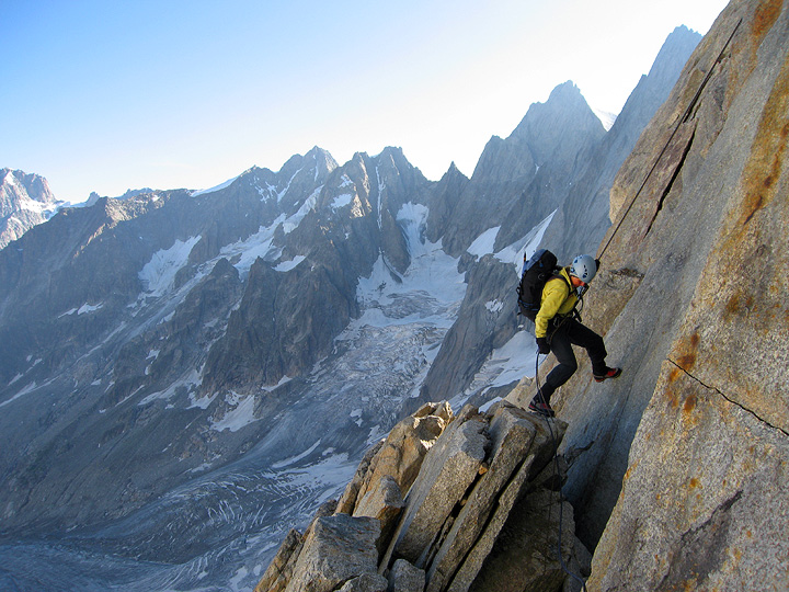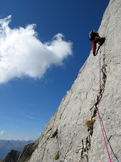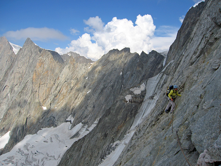 This is the rightward just traverse after the Rebuffat Crack. My hat is off to Gaston. The pitch bearing his name is quite hard, a bit devious and on great rock, the best we encountered. You can see the clouds building behind. |