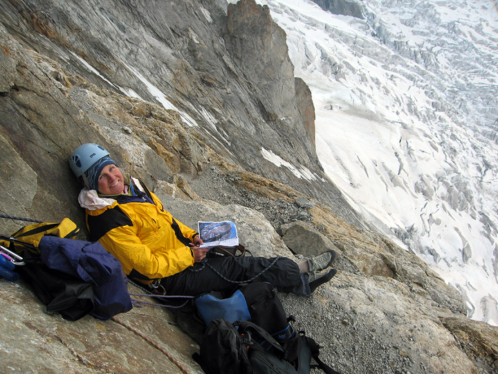 We continued up for a ways, starting up the first couple pitches of the 75-meter dihedral. But there are precious few bivy ledges, and, unfortunately, we were catching up with another party. Building gray clouds suggested that we would be better off finding a spot to sleep before too long lest we get stuck mid-pitch in a downpour. We fixed one of our two ropes in the dihedral and rappelled down to this roomy ledge. The weather was looking worse than forecast. No sooner had we laid out our meager bivy kit, it would start raining and we would have to partly pack up, stand up and huddle under our Ortovox sack. It would stop, we would lie down again, start and we would stand up, and on and on. It got rather tedious. We decided we had better call our friend Howie in Chamonix and see what France Meteo was prognosticating for the following day. (How odd is is to make phone calls from a high alpine wall.) The news was not encouraging–good in the morning, but stormy in the afternoon, somewhat worse tomorrow than today. Fearing getting stuck on a hard pitch just shy of the summit, we decided not to risk it and to go down the following morning. In spitting rain, I prussiked back up the fixed rope, cleaned the gear, and rappelled down to our ledge. In this photo, Kathy checks out the route description just before the first rain starts. Our cozy bivy ledge. |