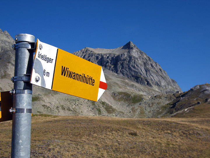 We had heard for years that climbing from the Wiwanni hut was not to be missed. With an extra day on our hands, and conveniently returning from Zermatt to France, we decided to check it out. It is a bit of an outing to hike up, do a route, and walk back down again in one day, but the weather was perfect and, well, so what! Wiwannihorn is the peak and the sign points to the hut, almost on the skyline. |
