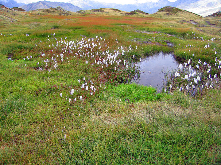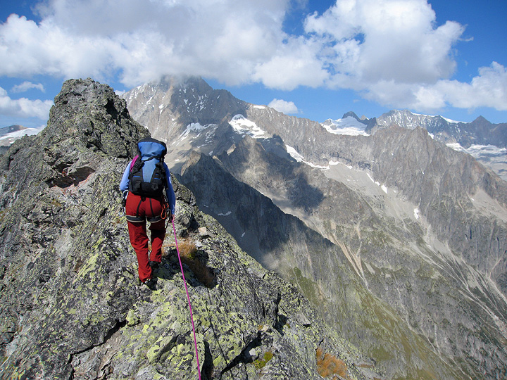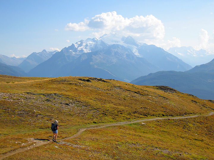 Hiking down in the afternoon. Behind is the Michabel group between the Mattertal on the right and the Saastal on the left. |