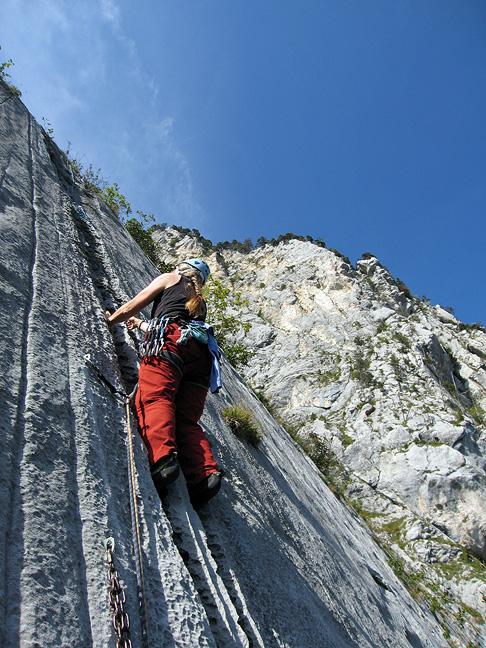 Here, Kathy climbs perhaps the best pitch on the route. Unfortunately, the next pitch has quite recently increased in difficulty significantly, as a large piece of it fell off. Lucky for us, new bolts had just been placed (we could still see the little piles of rock dust from their drilling) to protect the "new" section, which goes at about 5c or 6a. It is too bad, as this more difficult bit disrupts the homogeneity of the previous version of the climb. |