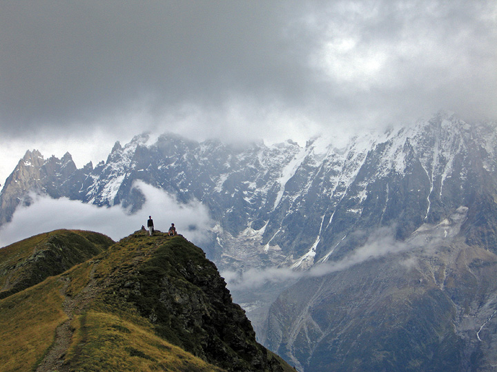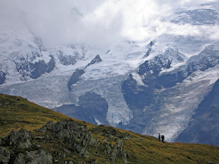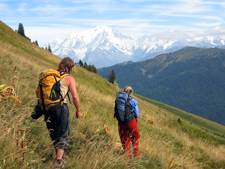 Hiking down from the Borderan, Mont Blanc in the background. |