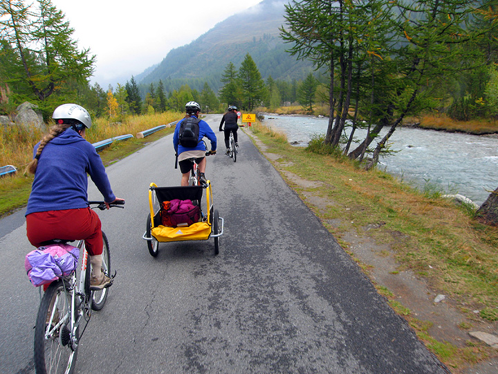 We had made a date with our friends Jasper (in the buggy), Ramsay (pulling it) and Heather (out front). What to do? Kathy had a great idea of riding bikes up the Val Ferret, just on the Italian side of Mont Blanc. |