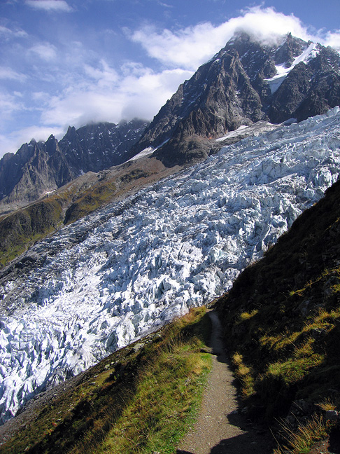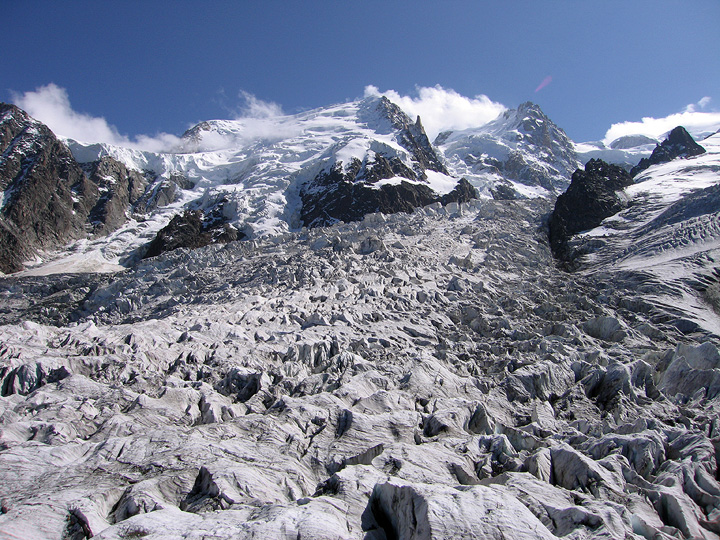 Looking up the Bossons Glacier towards Mont Blanc du Tacul and Mont Maudit. |