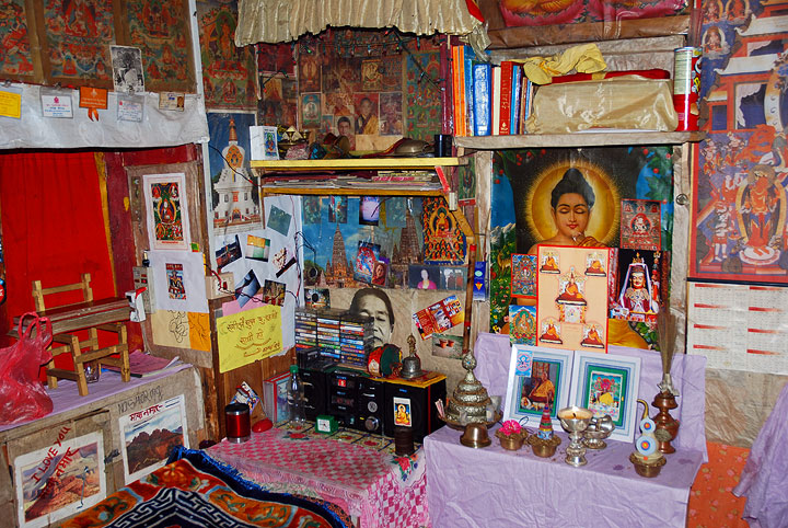 Arriving in Phakding early, Matt, Kathy and Mark wandered up the the hill to visit the local monastery. There we met a young monk who gave us a wee tour. Part of the tour included a view of his personal bedroom. |