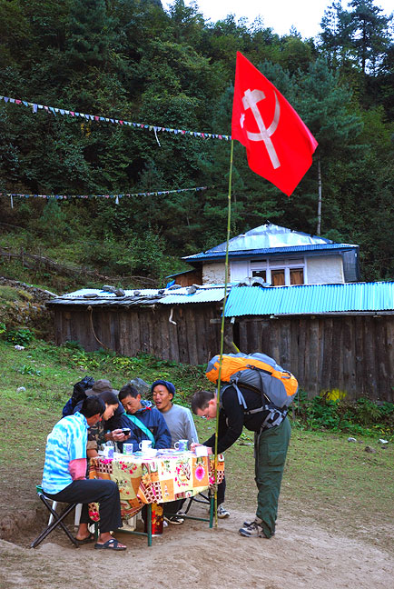 This year, the Maoists set up a collection post at the bridge in Phakding, taking "donations" for the United Revolutionary Peoples Council of Nepal – 100 Rupees (about $1.50) per person per day. They were quite friendly about it all, and even issued official-looking receipts. Here, they are amused by a photo of themselves that Emery took. This photo was taken on the way in. On the way out, the post had grown to include a large tent, with many folks milling about. And a week later, as part of the terms of the impressive agreement between the government and the Maoists, such collection posts all over Nepal simply disappeared. Or so we're told. |
