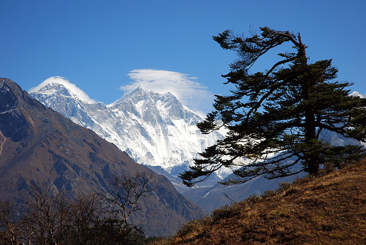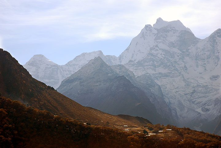 Our first views of Everest (left) and Lhotse from near Khumjung. |