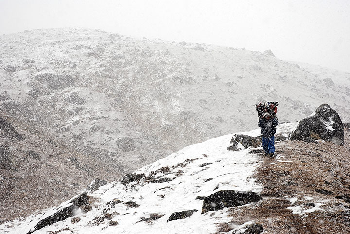 A porter in the afternoon snowfall, between the pass and Lungden, our destination for the night. |
