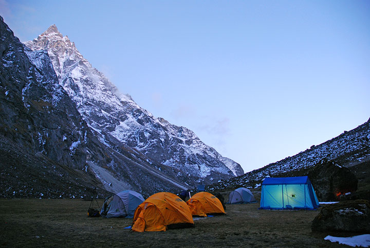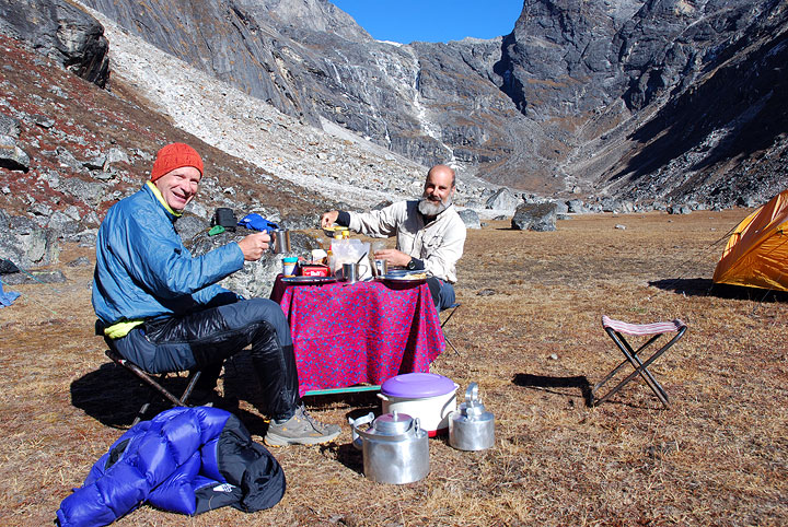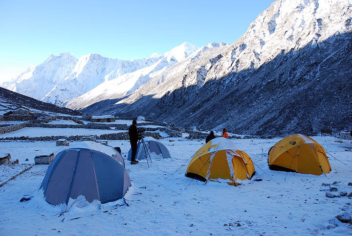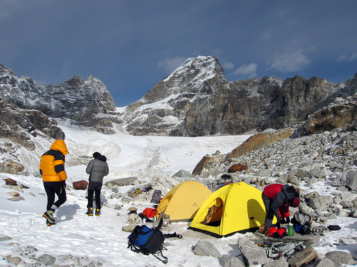 High Camp the following morning. Kyajo Ri behind. |