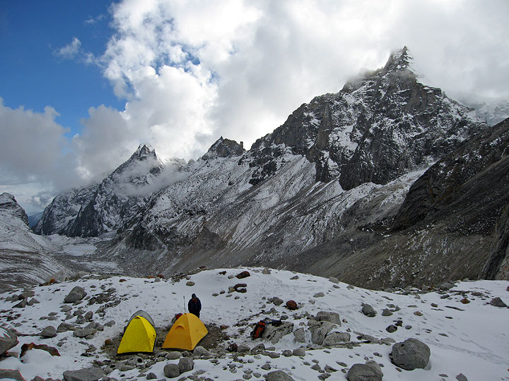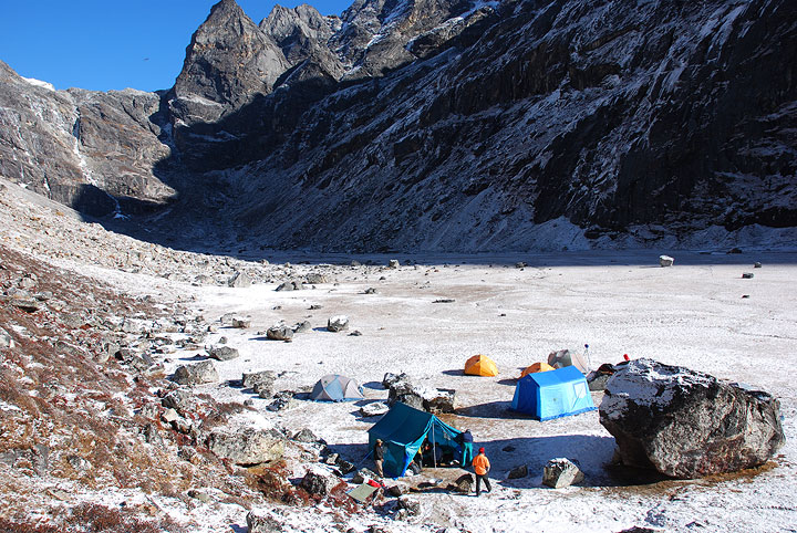 Our Base Camp in the Kyajo Drangka. Behind on the left is the first headwall on the route to high camp. |