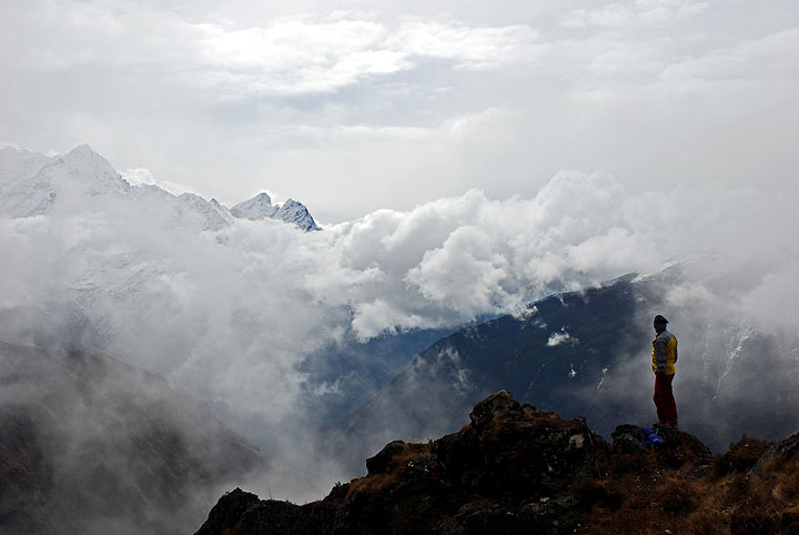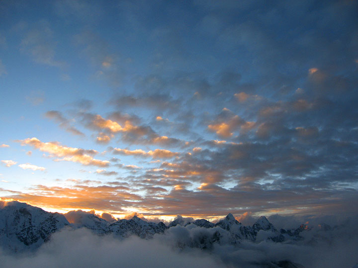 Sunset from somewhere on Kyajo Ri. Unfortunately, all the new snow this afternoon made the talus slopes and boulders below rather difficult and tedious, especially in the dark. We arrived back in High Camp about 8:30 pm. |