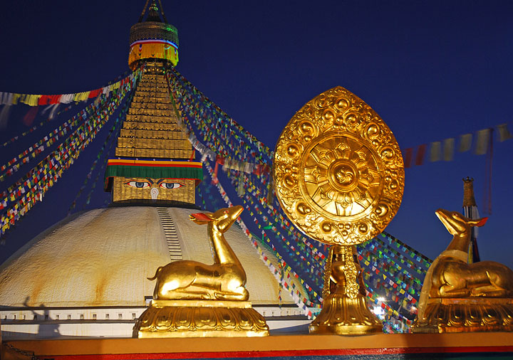 Nepalese expeditions invariably start in Kathmandu, as do their subsequent slide shows – and this one is no different. We planned to spend little time in Kathmandu, so the afternoon of our arrival, we took in Swayambhunath, Patan, and Bouddhanath. This photo is of the stupa in Bouddhanath, taken just after sunset. Full disclosure: This pic was taken after the trip was over, when Kathy and I went to Bouddha on our own. All my photos from the first day in Kathmandu ended up on our computer, whose hard drive died, and were lost (at least I'm not willing to spend the bucks to extract them). But there is a silver lining – we now have a bigger and faster hard drive, I got to take apart and reassemble our laptop (lots of fun, actually) and we went back to Bouddha and took more, and better, photos such as this one. |