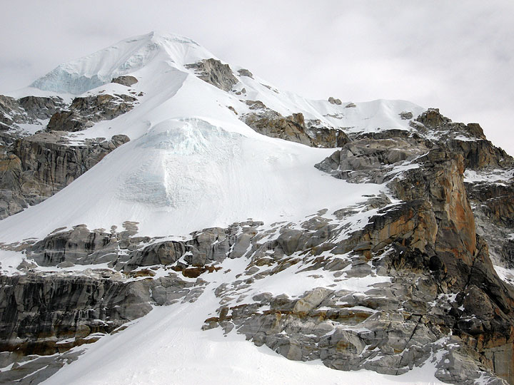 | Kyajo Ri, while not quite as well known as Everest, K2, or the Matterhorn, is a great peak – pointy, pretty darn high, and considerably harder to climb than, well, lots of other mountains. Two years ago Andy Latham and Kathy traveled to the Khumbu with the hope of making the ascent of the 6,186 meter peak. Information was sorely lacking and the duo spent much of their time simply scouting the best approach to the peak. Using their hard-won knowledge, we mounted another expedition in the Fall of 2006, with story and photos here. Unfortunately, Andy was unable to join us and was sorely missed, but we did manage to convince the fearsome threesome of Emery Dameron, Jean-Claude Latombe and Matthew Scott to come along. On this trip we began with an acclimatization trek that wandered through Gokyo, over the Renjo Pass, down to Thame, on to Mende before heading into Base Camp. |