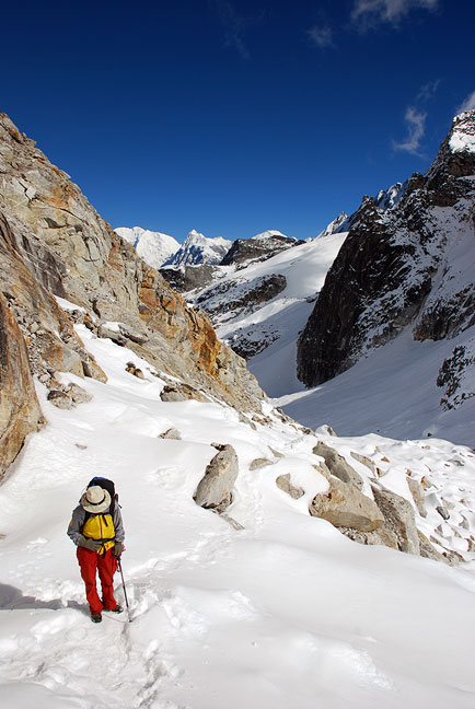 Having none of these things, we thought "we'll take a look" as the Swiss guides often say. As it turned out, we were hot on the heels of a party going up, and also met a large party coming over the pass from the other direction. Great luck for us with inadequate footwear! |