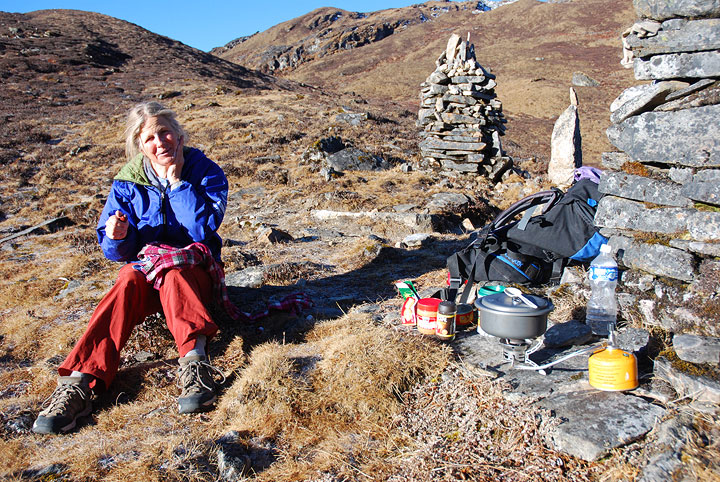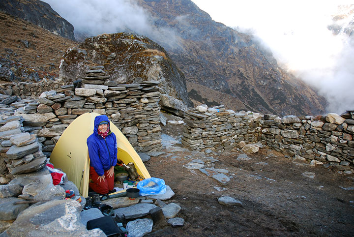 | Back in the warmth and comfort of our little house in Bishop, and months before we actually left for Nepal, we thought "Let's do a climb after Kyajo Ri!". It sounded good at the time some 8000 miles away, and months in the future. But fortunately, the best laid plans are often revised to suit reality. With airline tickets that required we spend another two weeks in Nepal after the Kyajo Ri Expedition, we needed to do something, but more climbing just didn't appeal–the cold, the complications of hiring porters, the cold, the hassle of needing a "staff" to comply with the new "must-have-guide" regulations, the cold, the cost of permits and all, and, lest we forget, the cold. As a reasonable, and hopefully less cold alternative, we decided to go trekking. We had never been to the Langtang, and being relatively close to Kathmandu, no expensive plane flights were needed. Logistics would be a snap. We mulled over route options, and ultimately decided that the only sporting itinerary included a traverse of the Ganja La, a high pass reputed to be one of the most difficult of the main trekking passes in Nepal. This route required that we actually camp out a night or two (more cold). The solution? Deny, deny, deny. We packed up a superlight tent (about a kilo) and a couple virtually non-existent Marmot Atom "sleeping bags" (rated to a whopping +40 F) each weighed about half a kilo and pack into a cantaloupe-sized bag. We figured that we could suffer for our hopefully only one night out. And we did. For those interested, here is our itinerary: