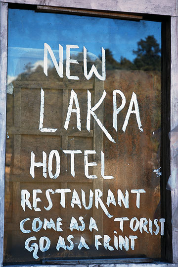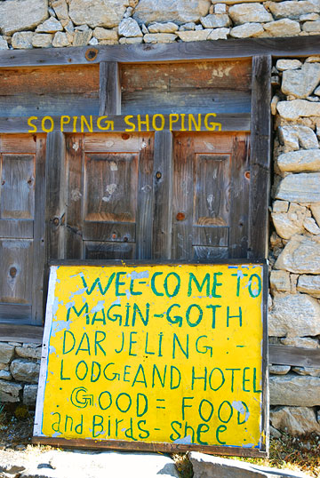 | I love the advertising signs in Nepal. "Come as a Torist, go as a Frint". Or "Soping Shoping" and the complex formula of "Good=Food and Birds-Shee" | |