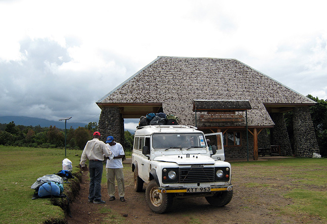 Our first day involves about a 3 and 1/2 hour drive from Nairobi to the Sirimon gate, by way of the market town of Nanyuki where we pick up porters, cook, and supplies. Arriving at the trail head, we sign in with the Park and are on our way to our first hut, at Old Moses camp. |