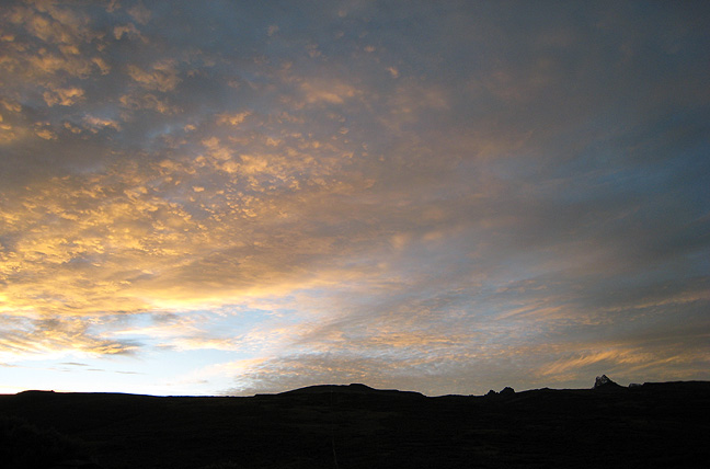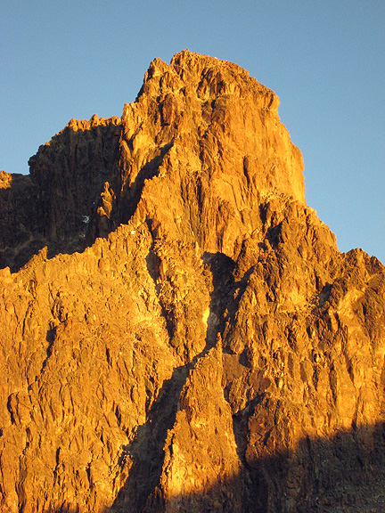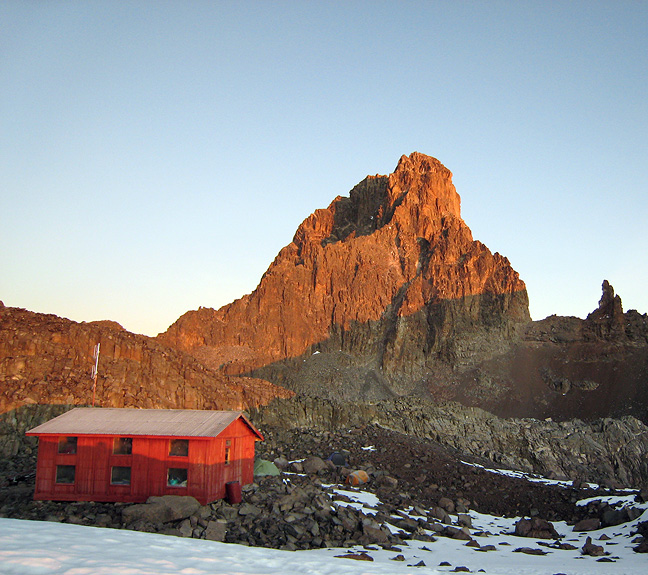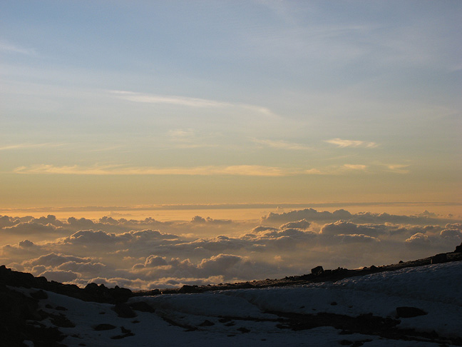 On our "rest" day, Andy climbed Point Lenana at sunrise, while Kathy scouted the way to the base of the climb to facilitate the pre-dawn start the following day. The sunrise from Austrian hut was lovely skimming over the lowland clouds. |